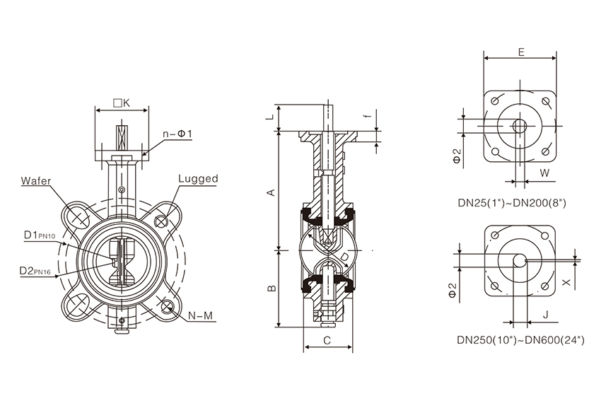 mm | inch | A | B | C | D | D1 | D2 | N-M | L | Φ2 | □K | E | n-Φ1 | f | J | W | X | type A | type LT |
